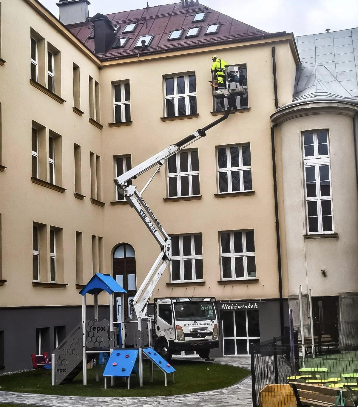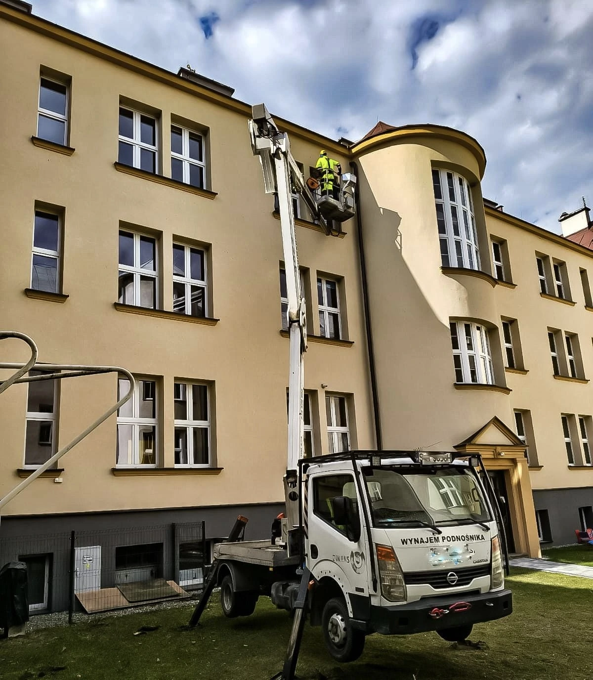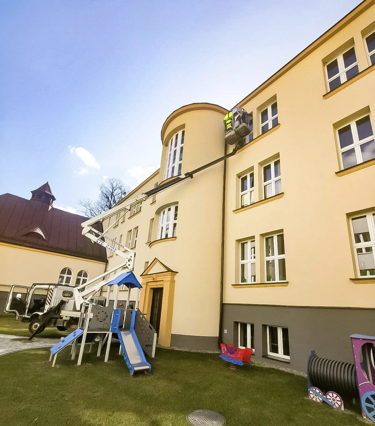 W trakcie realizacji wykorzystaliśmy zarówno techniki alpinistyczne, jak i podnośnik koszowy, co pozwoliło na sprawne i bezpieczne wykonanie prac na różnych wysokościach oraz w miejscach o ograniczonym dostępie.